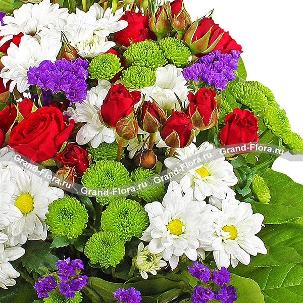 Стандартный (на фото): хризантема белая кустовая - 3 шт., роза красная кустовая - 4шт., хризантема зеленая кустовая - 4 шт., статица - 3шт., салал, сетка.