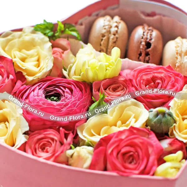 Коробочка любви + сертификат - коробка в виде сердца с розами и макарунс + сертификат