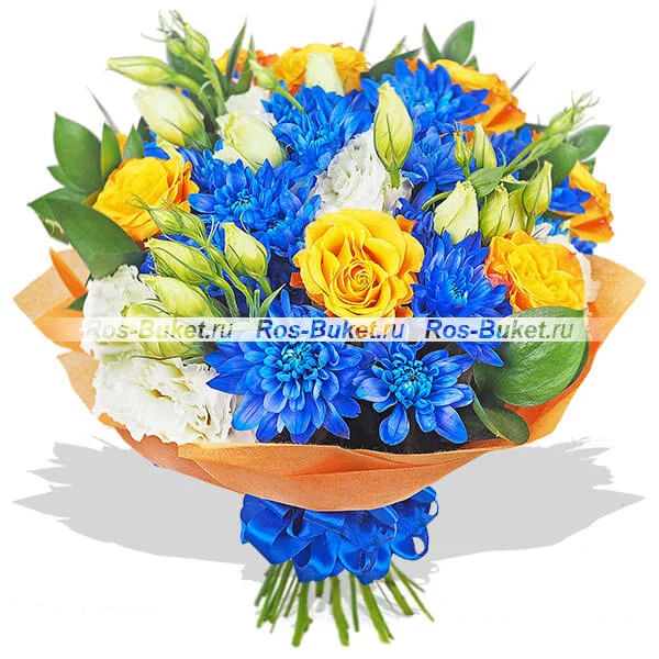 ЛЮКС: роза кустовая желтая - 4 шт, эустома белая - 6 шт. хризантема кустовая синяя - 5 шт, рускус, оранжевый фетр, бант синий.
