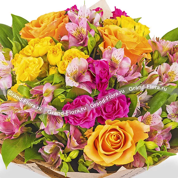 Стандартный: оранжевая роза - 3 шт, кустовая розовая роза - 2 шт, альстромерия розовая - 5 шт,