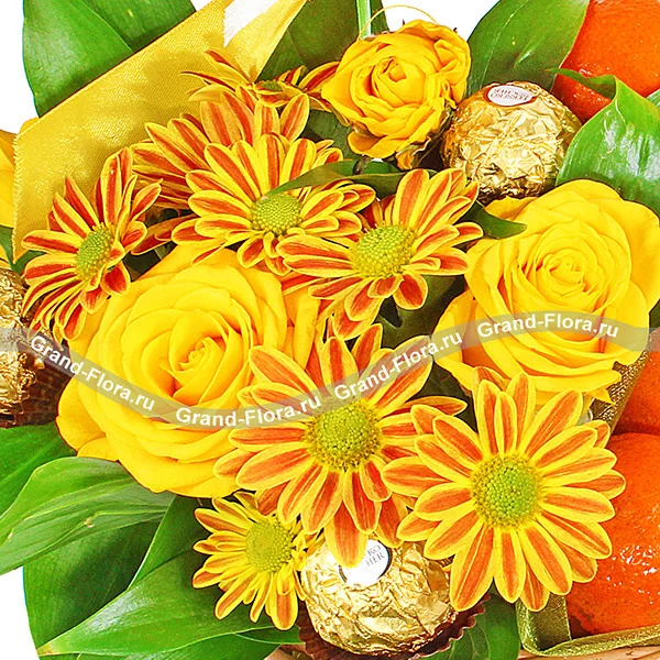 ЛЮКС: хризантема кустовая оранжевая - 5 шт, роза кустовая желтая - 4 шт, мандарины - 2 кг (возможна замена на апельсины), конфеты Ferrero Rocher, рускус, оазис, лента , корзинка.