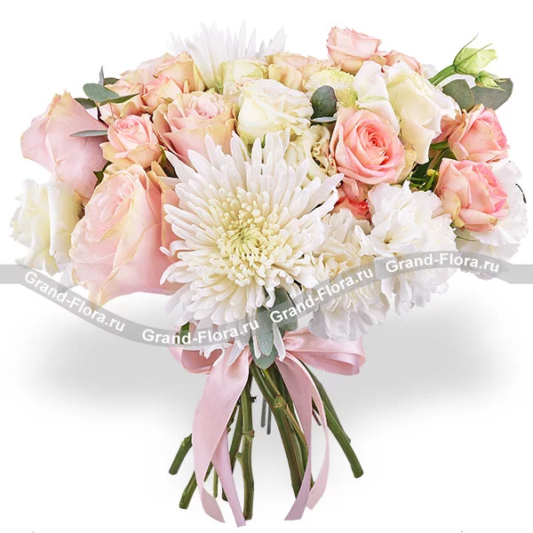 Люкс: хризантема белая одноголовая - 4 шт., роза розовая - 8 шт., роза кустовая розовая - 5 шт., эустома белая - 4 шт., гвоздика белая - 6 шт., эвкалипт, лента. Примерный размер: 40Х40 см.