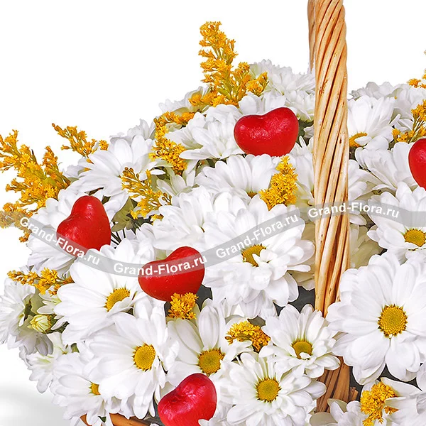 Композиция из очаровательных белых ромашек, дополненная солидаго и выразительными декоративными красными сердечками наверняка запомнится получательнице своей наивной простотой. Яркая и нежная композиция проложит путь к сердцу интересующей Вас девушки. Букет в корзине поможет выразить любовь к маме в день ее рождения и к девушке в годовщину отношений.
